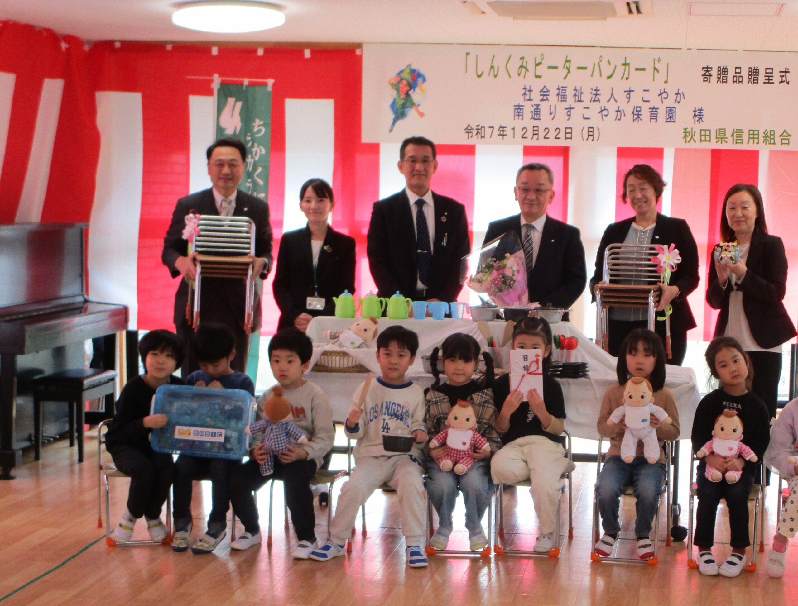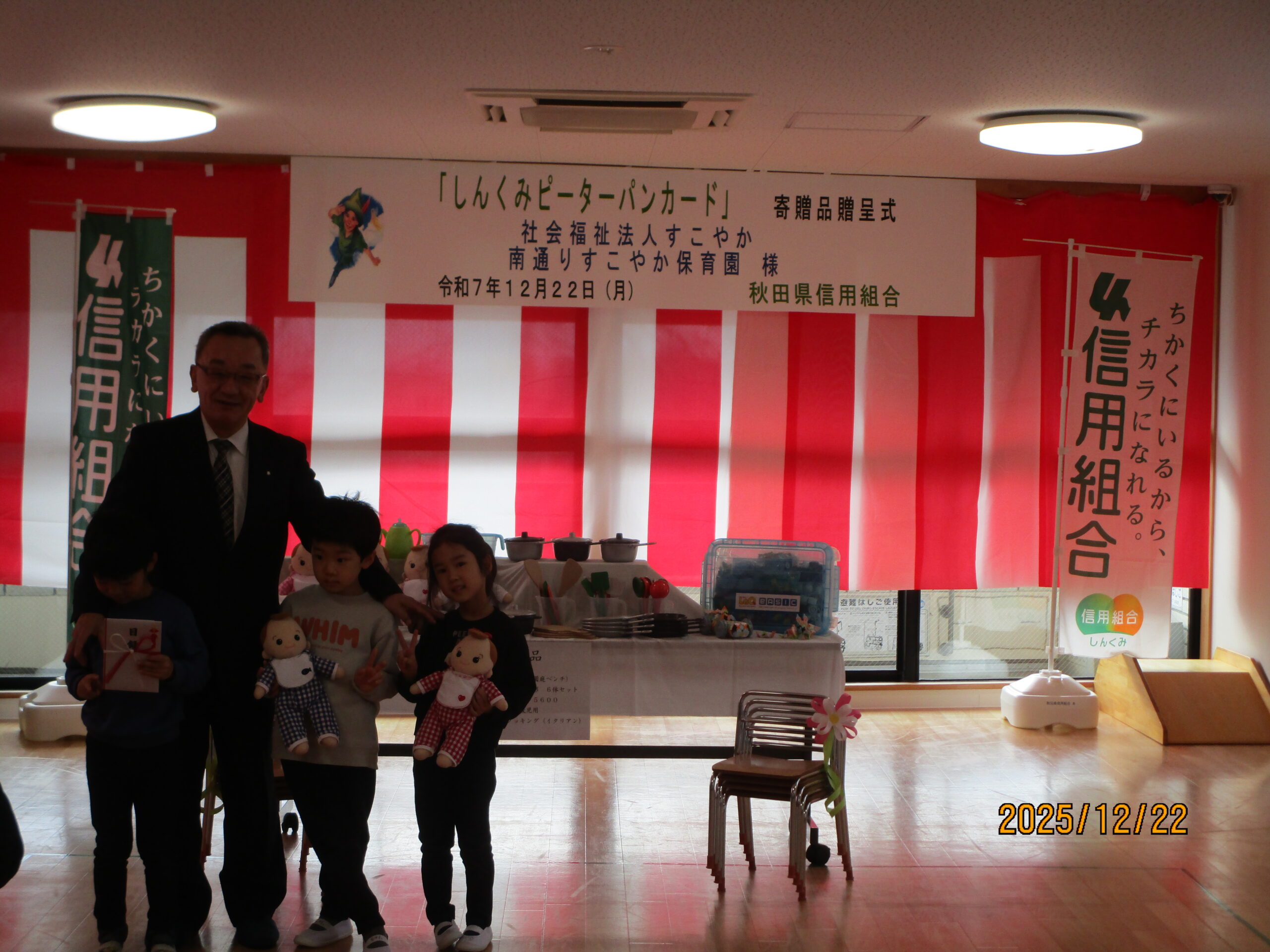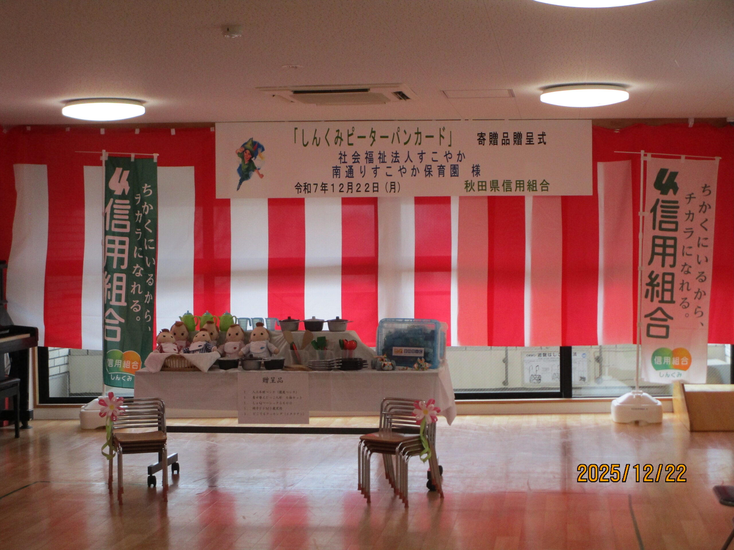 秋田県信用組合さんから、子ども達のためにお人形・おままごとセット・ラキューなどたくさんの玩具や、園児用椅子、園庭用のベンチを寄贈していただきました!保育園を代表して年長さんが式に参加し、感謝の気持ちを伝えましたよ。いただいた物はみんなで仲良く、大切に使いたいと思います。ありがとうございました!!