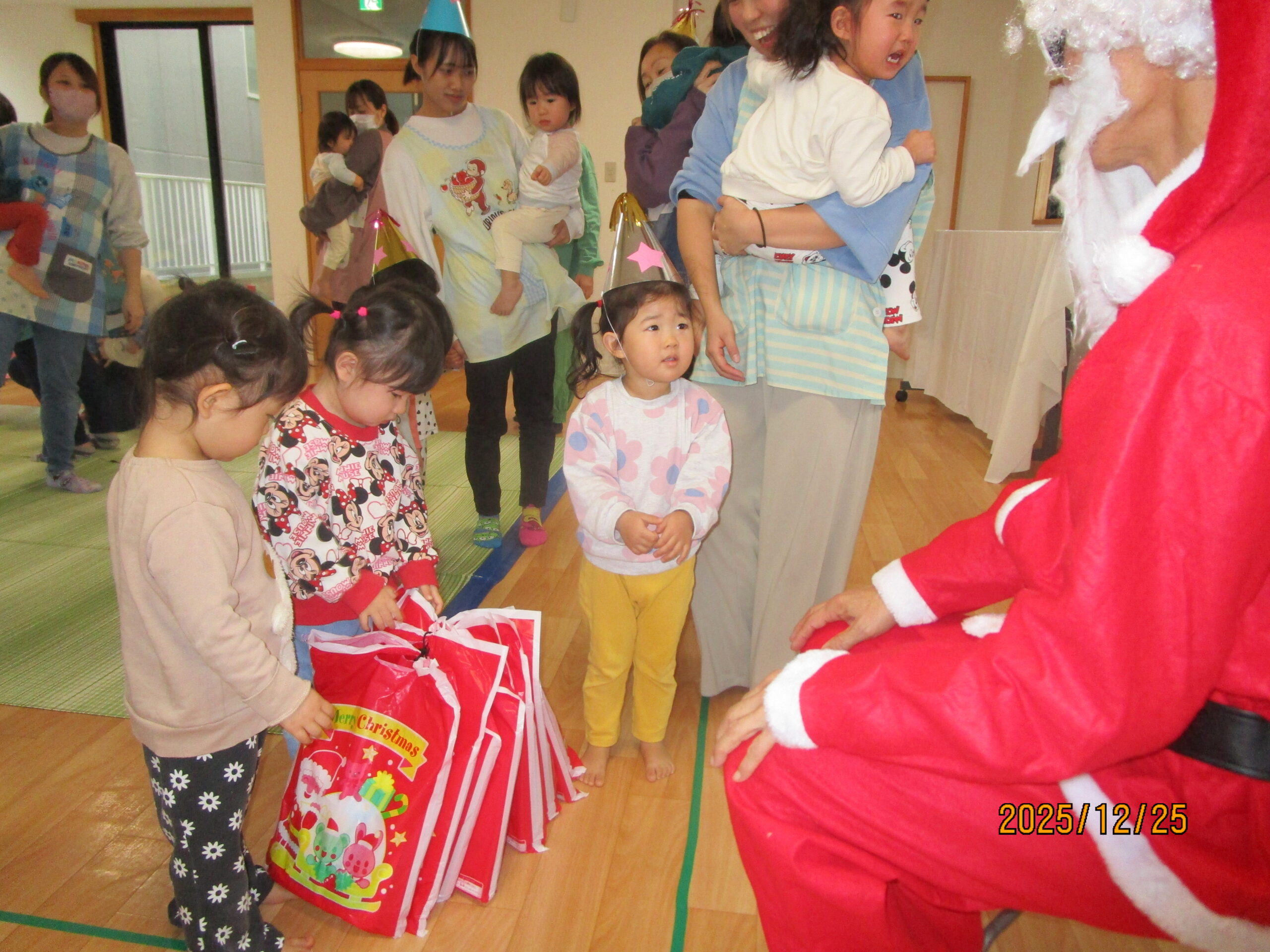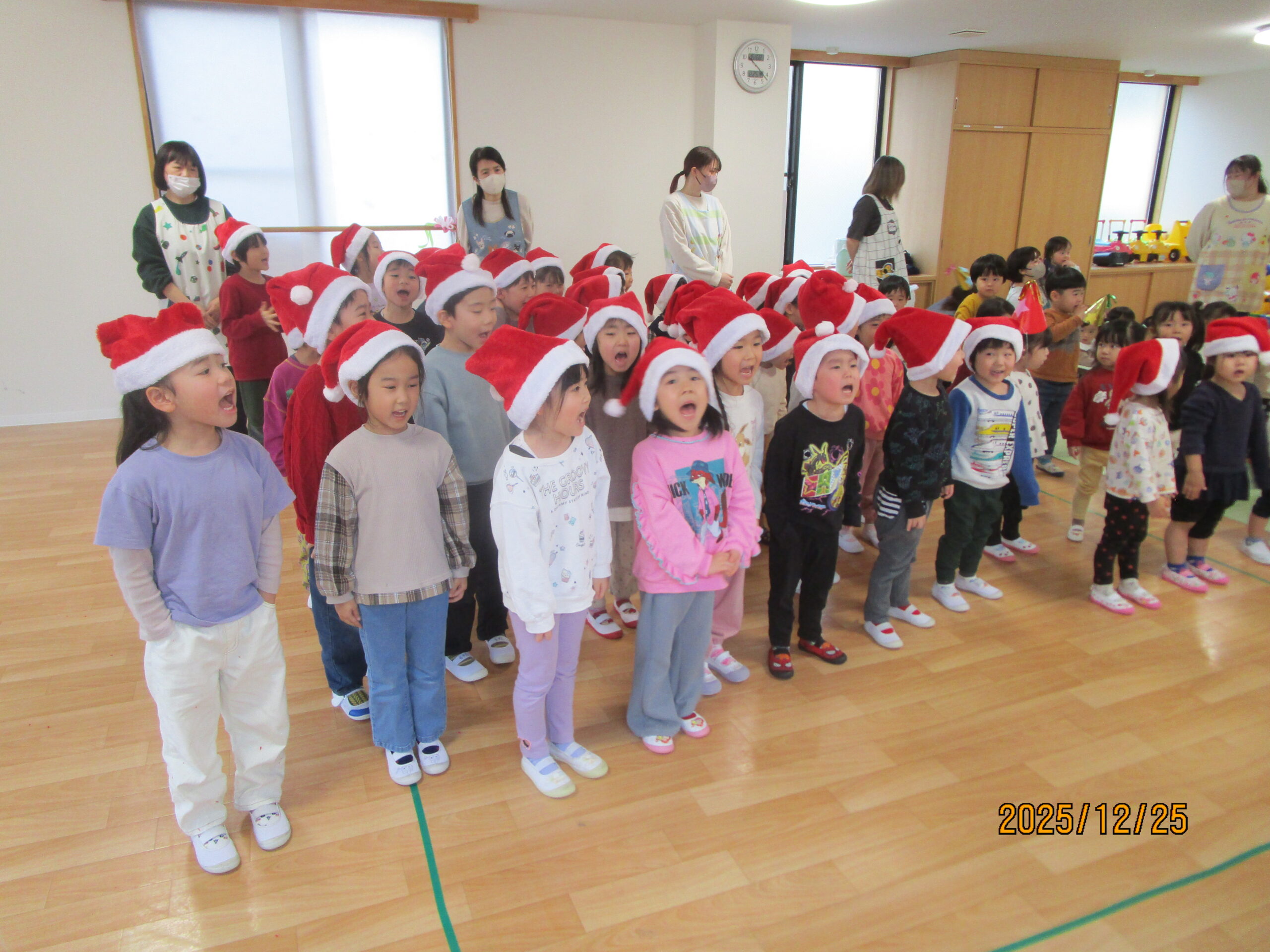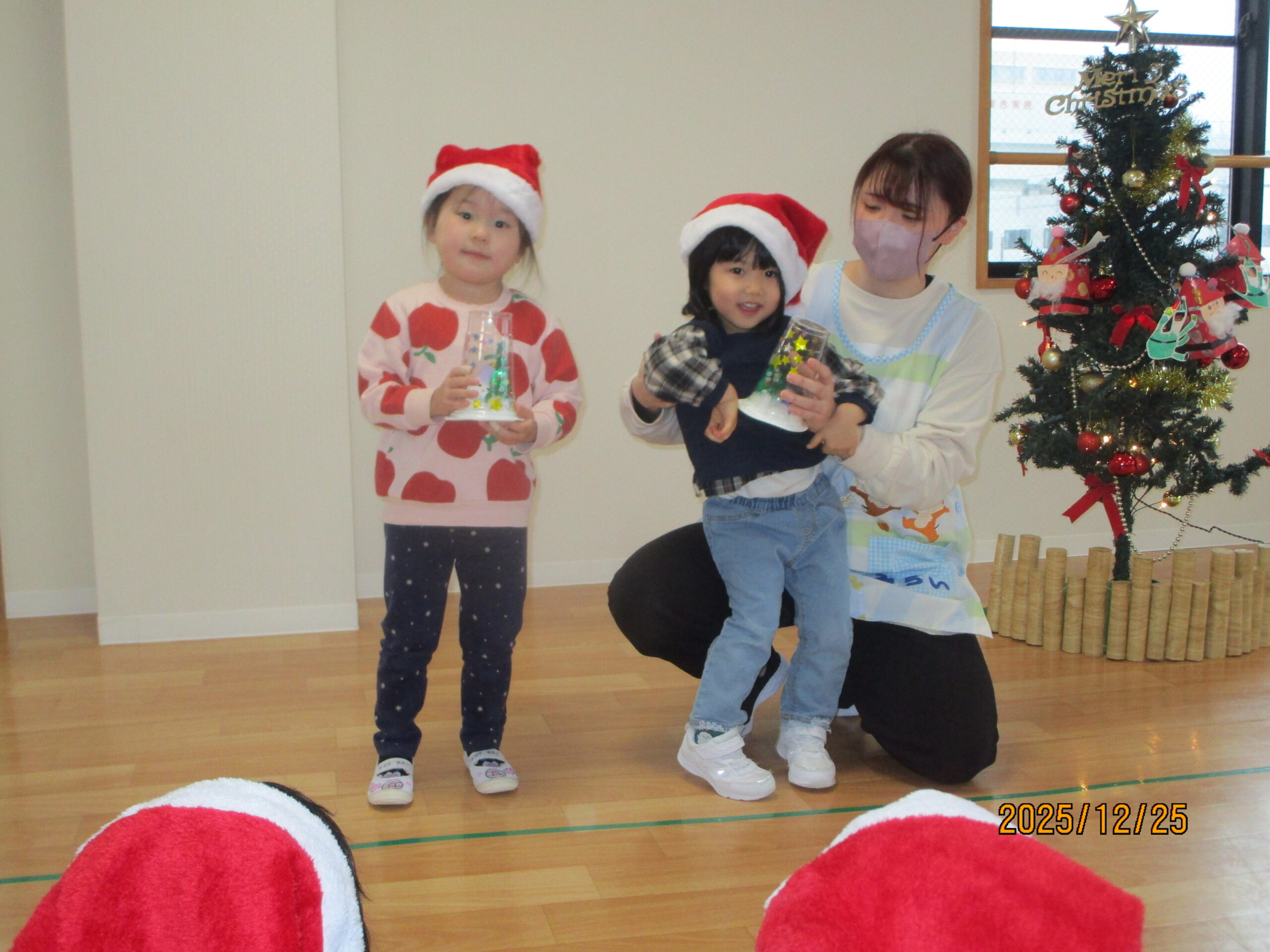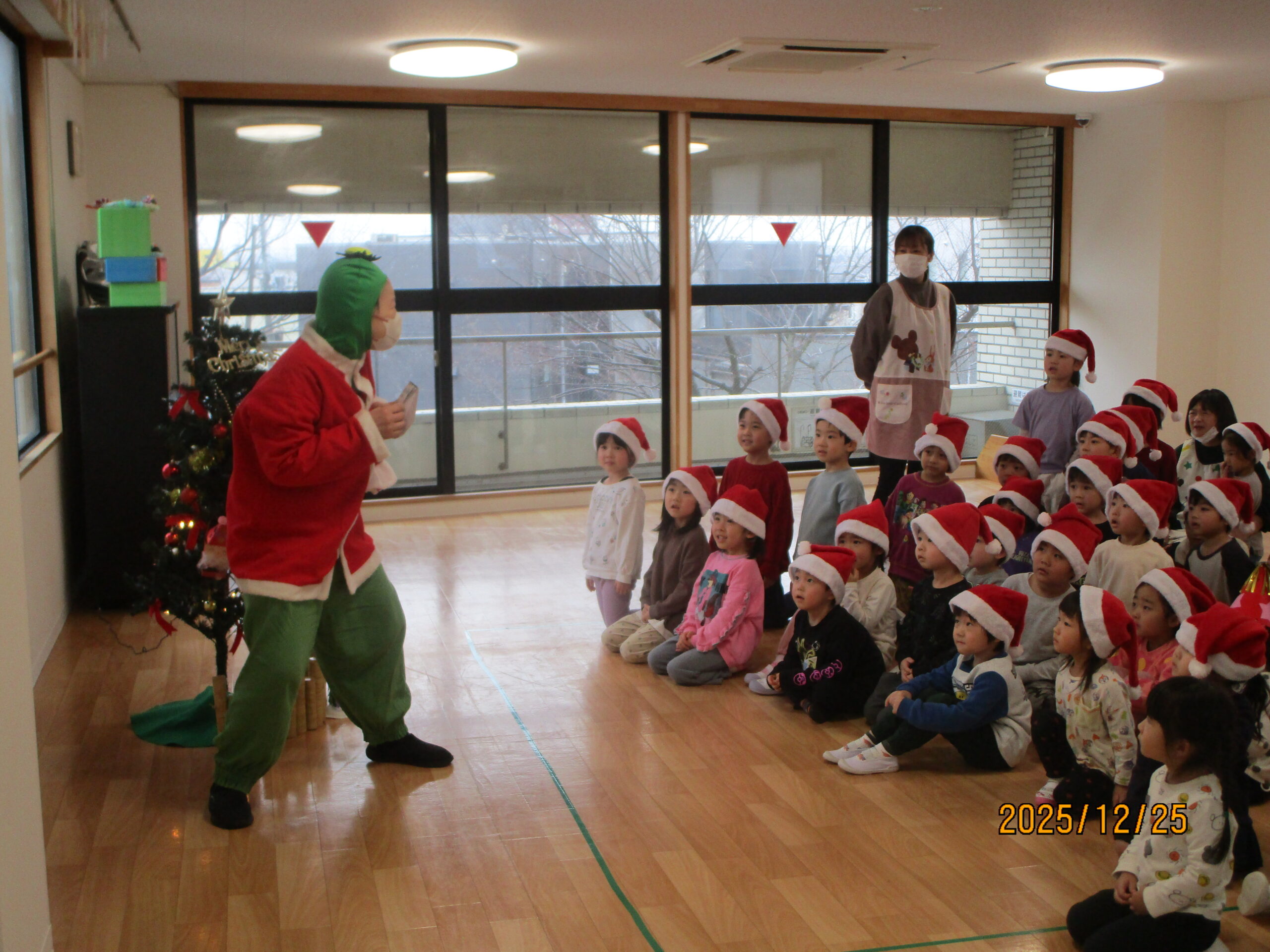 25日、みんなでホールに集まってクリスマスお楽しみ会を行いました。各クラスのクリスマス制作もとても素敵でした★先生たちからのお楽しみの紙芝居と「靴下ダンス」に釘付けの子ども達。クリスマスソングを歌うと、楽しい音楽につられて河童さんも遊びにやってきましたよ!そしていよいよ・・・保育園のみんなはとっても良い子なので、大きな袋にプレゼントをたくさん詰めて、サンタさんが来てくれました!クリスマスメニューもモリモリ食べました!メリークリスマス♪♪