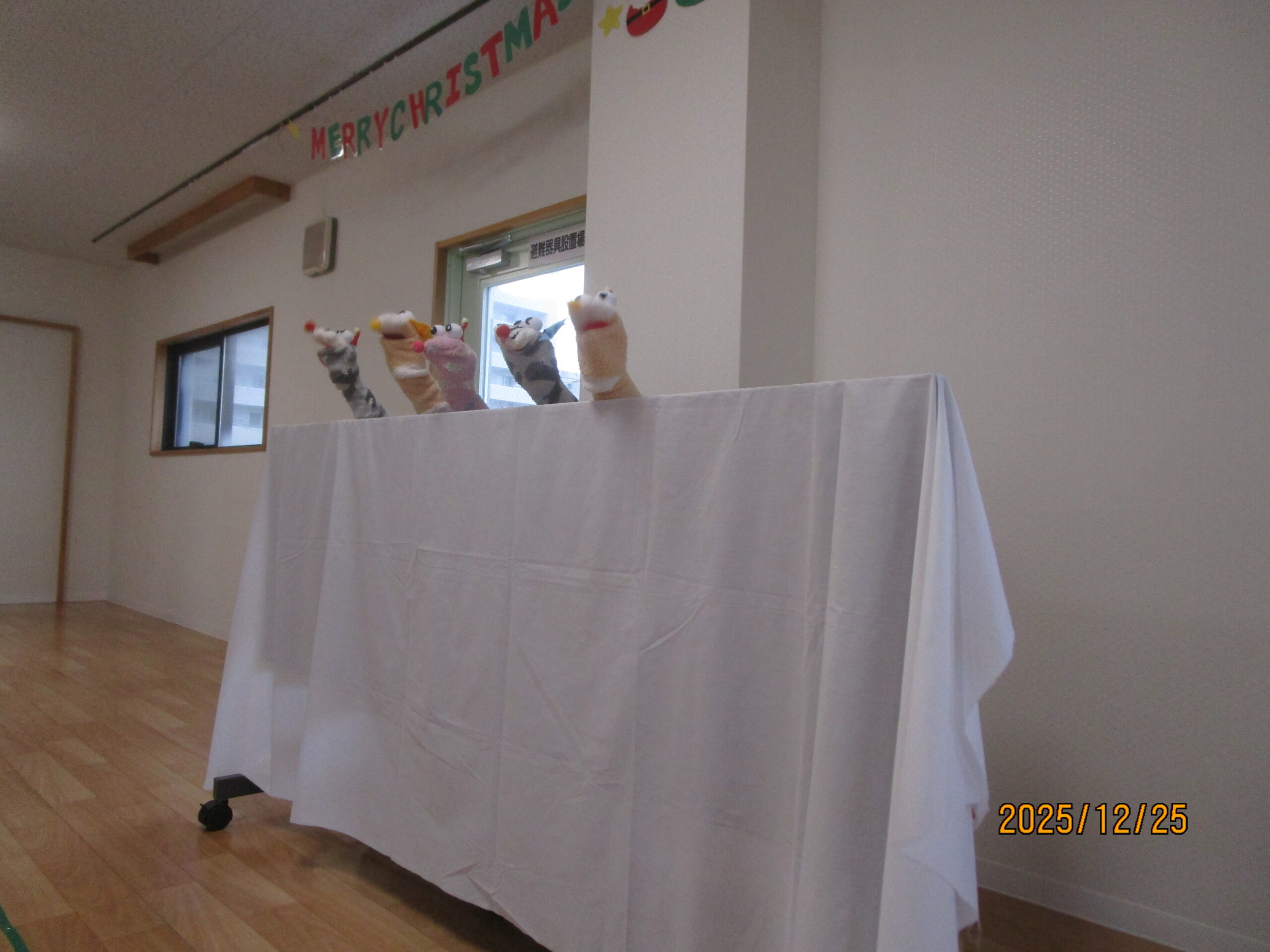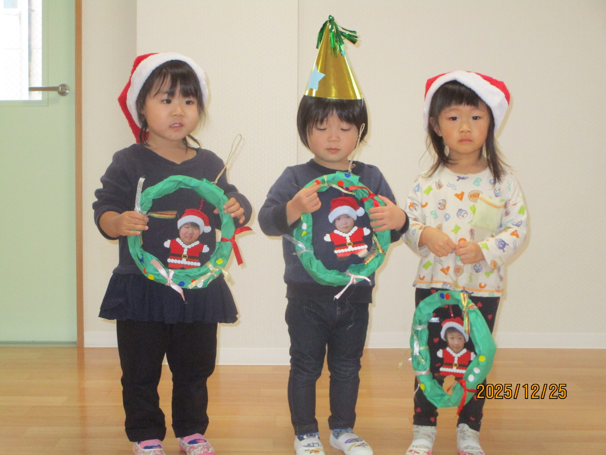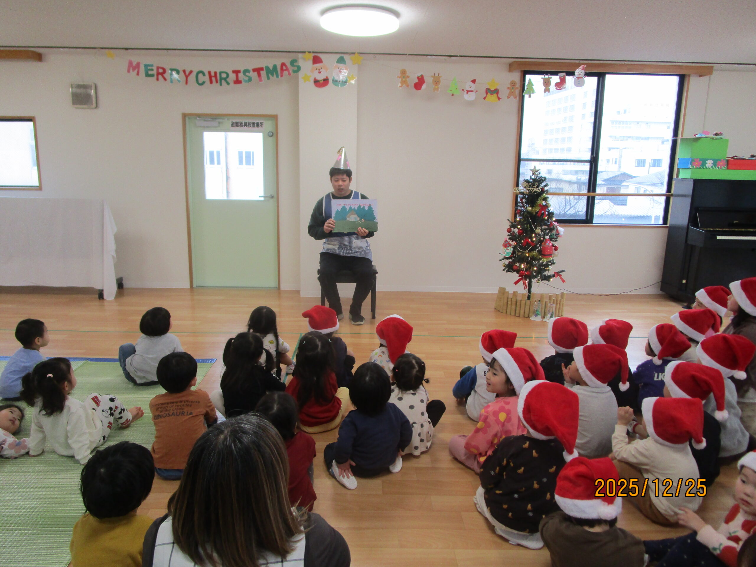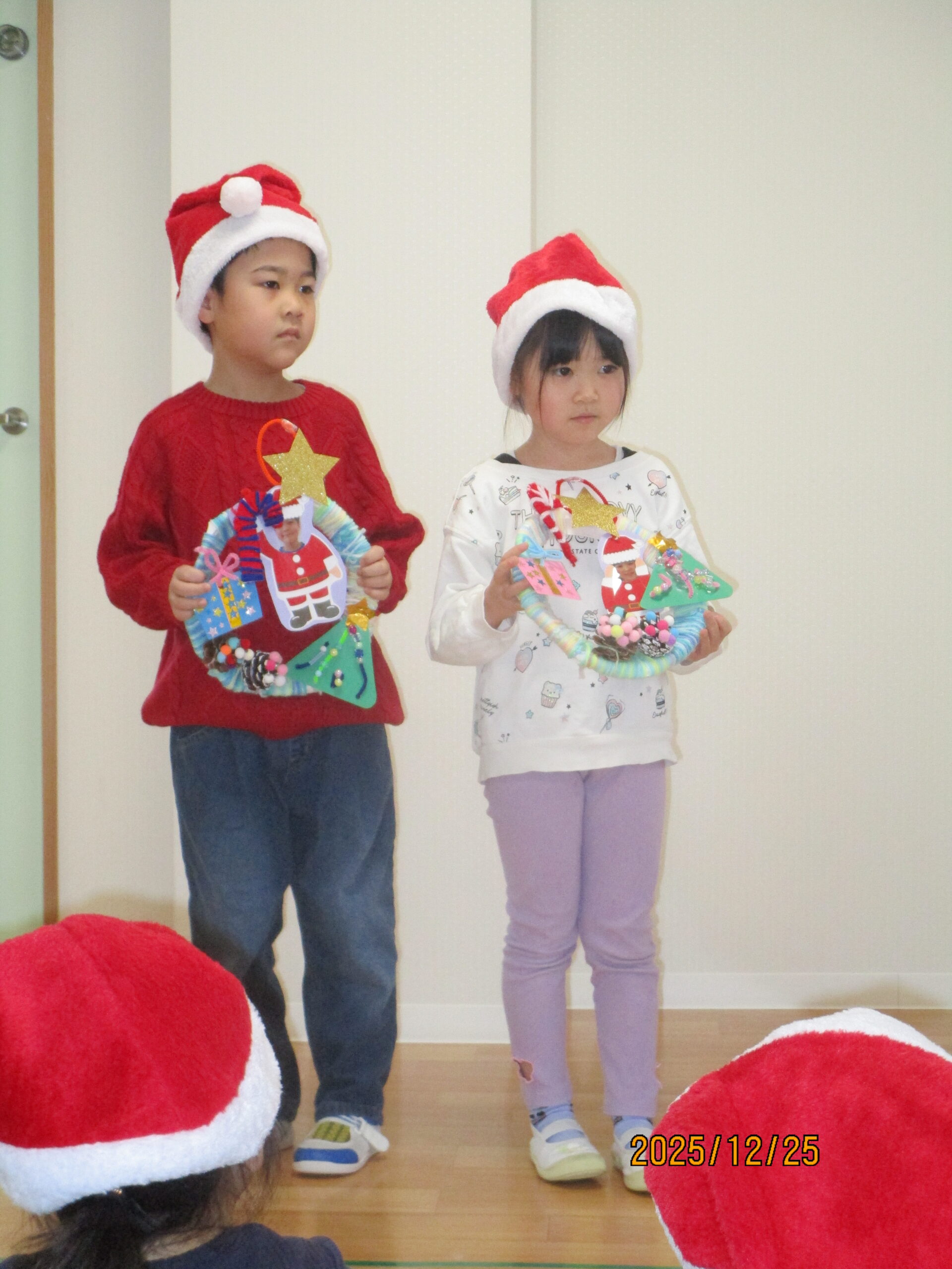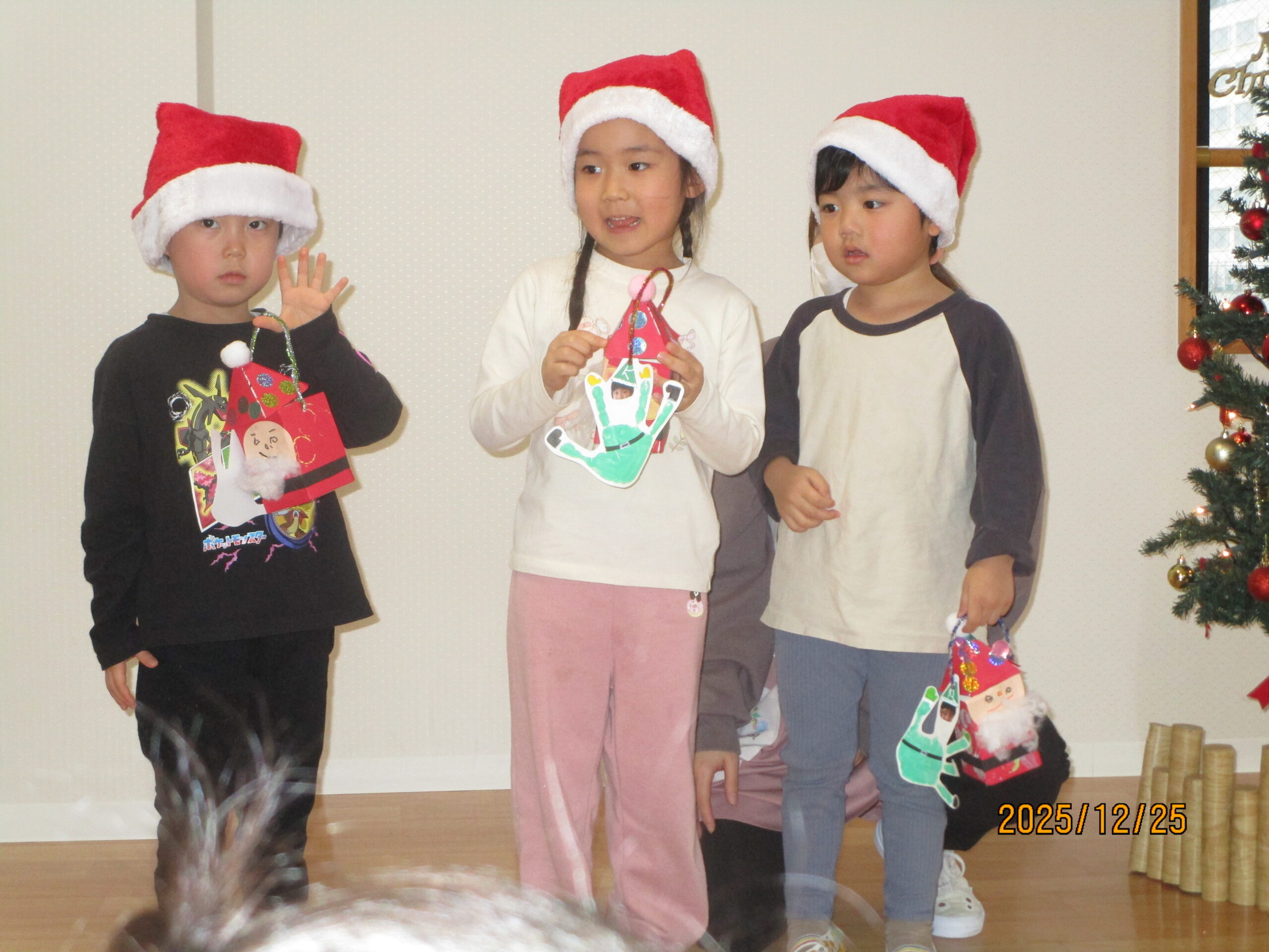 25日、みんなでホールに集まってクリスマスお楽しみ会を行いました。各クラスのクリスマス制作もとても素敵でした★先生たちからのお楽しみの紙芝居と「靴下ダンス」に釘付けの子ども達。クリスマスソングを歌うと、楽しい音楽につられて河童さんも遊びにやってきましたよ!そしていよいよ・・・保育園のみんなはとっても良い子なので、大きな袋にプレゼントをたくさん詰めて、サンタさんが来てくれました!クリスマスメニューもモリモリ食べました!メリークリスマス♪♪